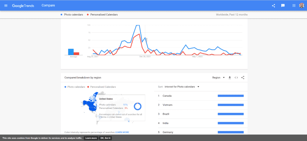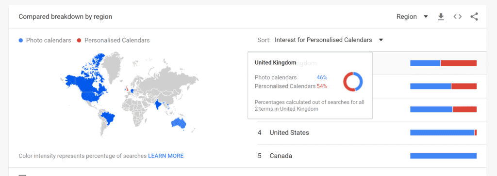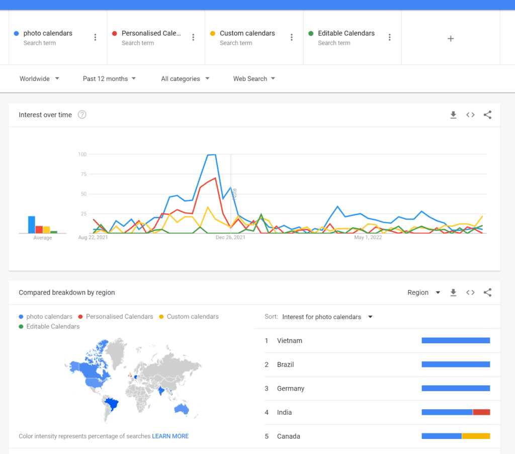 By comparing these keywords string, Photo Calendars, Personalized Calendars, Customized Calendars, and Editable Calendars, we found that depending on the region these keywords attract audiences differently.