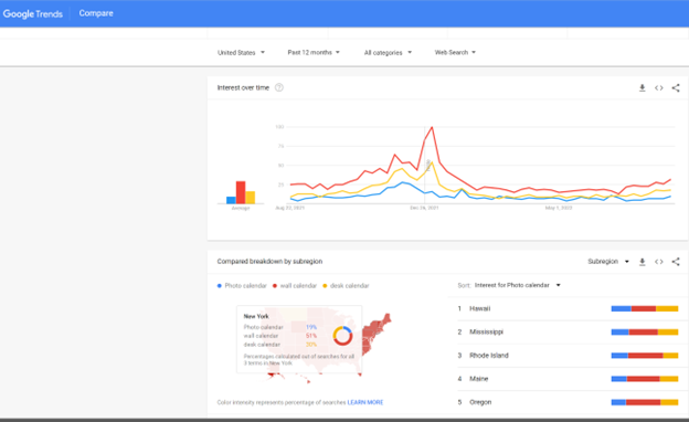 All this while in the State of New York 51% of web searches ask for a Wall Calendar, 31% for a Desk Calendar, and 19% for a Photo Calendar.